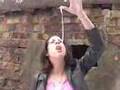 Description: Some Yankee chick from Joisey stretches her gum in preparation for naughty bubble gum blowing in the snow. |